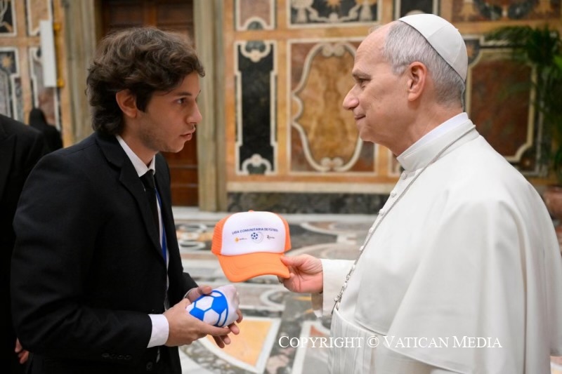 En ese marco, el Santo Padre recibió un banderín y una gorra de la Liga Comunitaria de Fútbol, obsequio entregado por su director Ariel Malvestitti, quien participó del encuentro y lleva adelante esta iniciativa. La Liga Comunitaria de Fútbol es un proyecto que busca construir, junto a diversas organizaciones sociales, civiles y religiosas, una red que promueva el derecho al deporte, la cultura, la salud y la inclusión de niños y niñas de los barrios más humildes. Forma parte de la Comunidad Padre Misericordioso, una asociación civil comprometida con la lucha contra las adicciones.